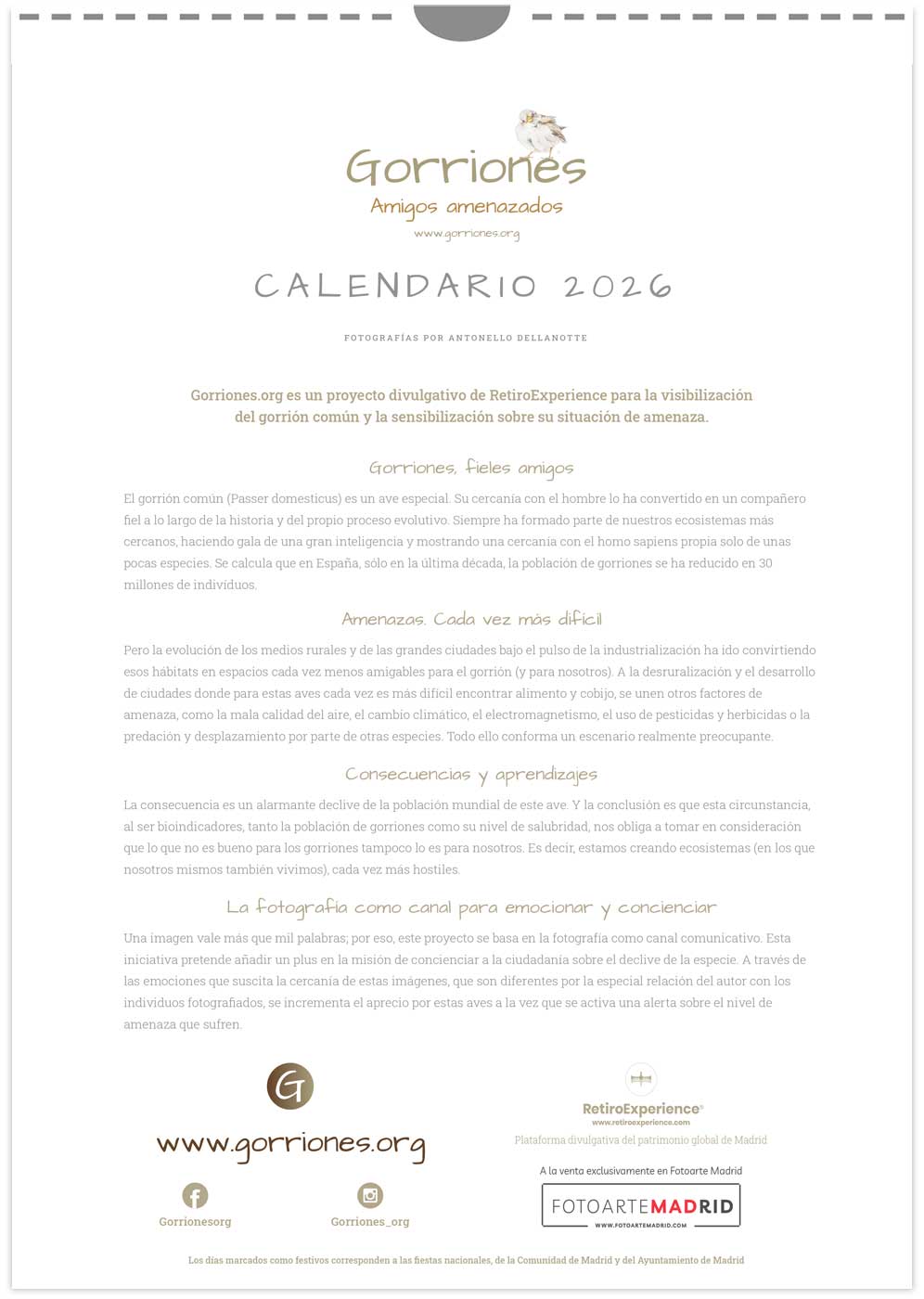 Calendario RetiroExperience edición Gorriones.org 2026